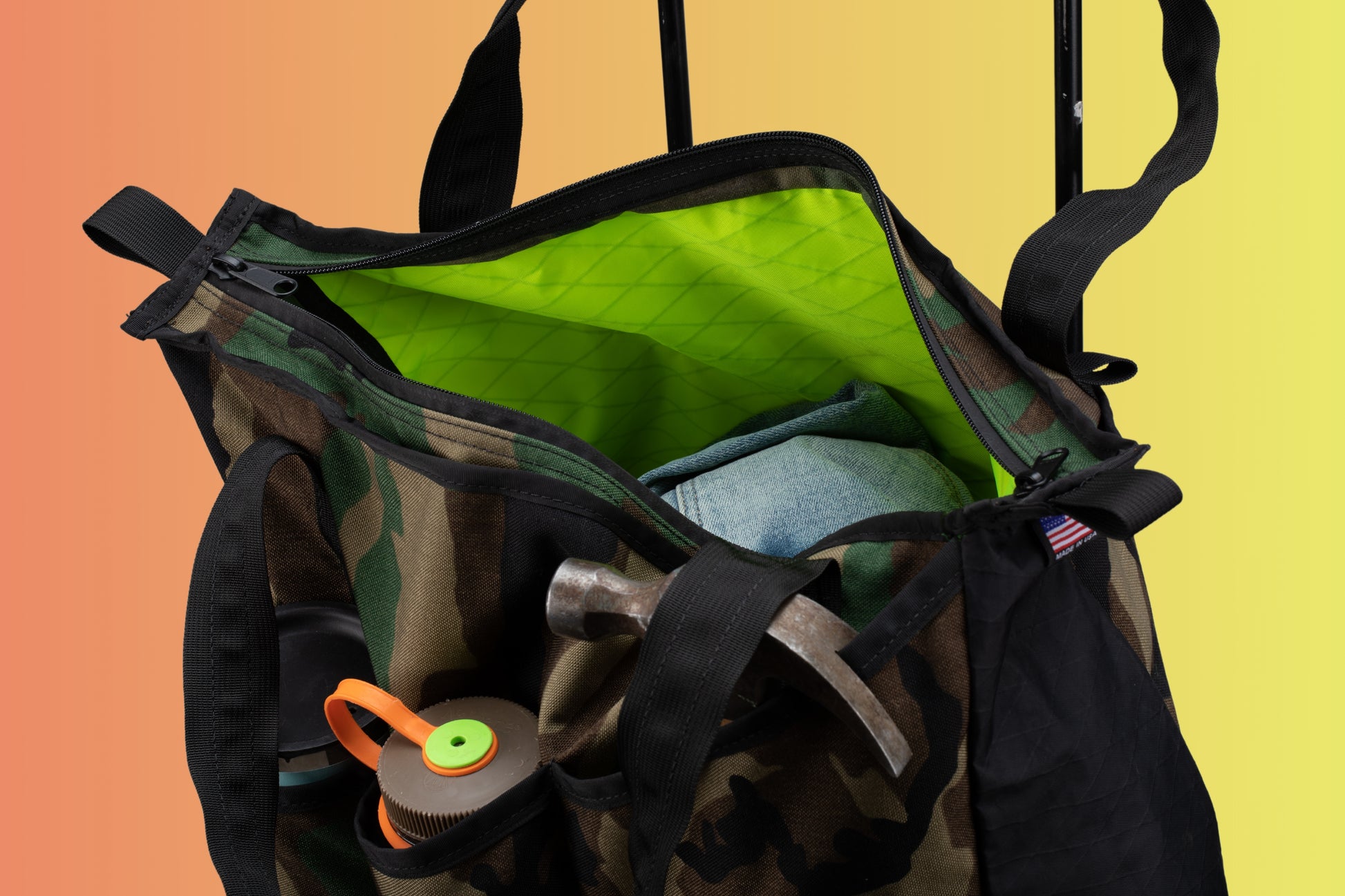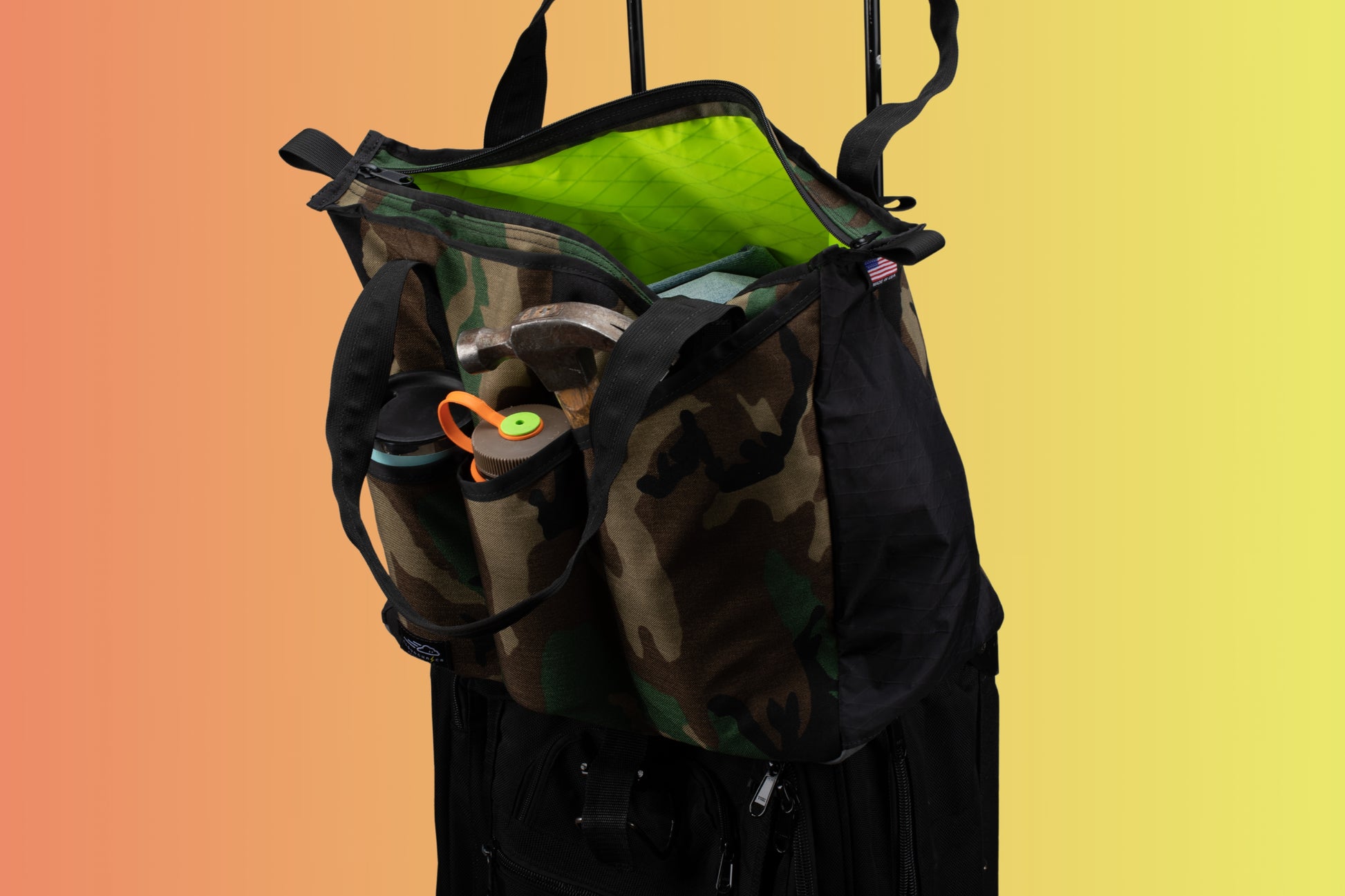 It has a smart pyramid shape design that stands up even when empty. Opens wide for easy access with highly weather resistant YKK Aquaguard zippers. External bottle pockets and daisy chains to quickly access your daily essentials. Rear luggage handle slip pocket to attach to your favorite rolling luggage. Constructed of X-PAC VX21 top with X50 bottom. Optional quick release shoulder strap.